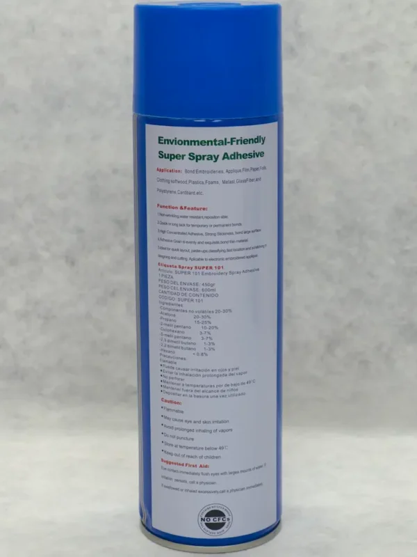 ADHESIVO EN SPRAY ADHESIVO MULTI PROPOSITO CONTENIDO 600 ML. MODOS DE USO: 1. FIJACION DE APLIQUES MAQUINAS BORDAR 2. SUBLIMACION DE MANILLAS, CAMISETAS, PANTALONES Y CHAQUETAS 3. PLOTTER DE CAMEO 4. FIJACION TRAZO A LA TELA DE CORTE. EL PEGAMENTO SE DISUELVE CON EL AGUA LO CUAL LO HACE MUY UTIL PARA APLICAR SOBRE TEXTILES, NO ENSUCIA Y AHORRA MATERIAL AL SER EN SPRAY. PEGAMENTO PARA PALETA EN PULPO SERIGRAFICOS, FUNCIONA IDEAL PARA PLAYERA, SUDADERA Y TELA EN GENERAL. PEGAMENTO FIJADOR PARA MAQUINAS DE BORDADO, GORRA.